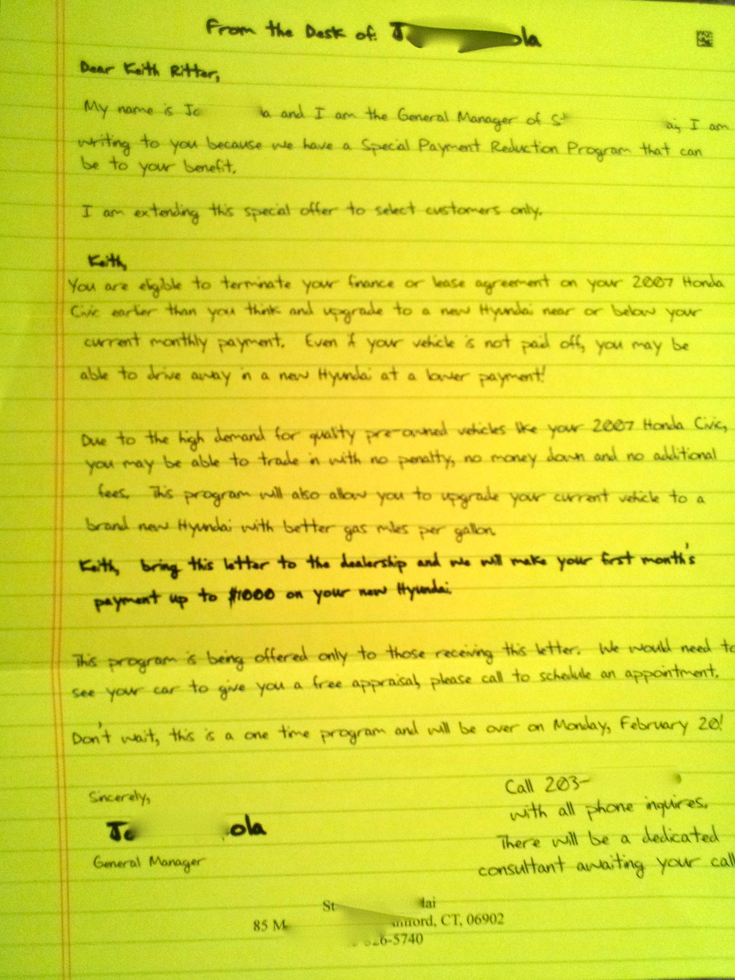 That big yellow blob over there is a letter I received from a local auto dealer. While it might be hard to tell from the photo, this is a printed document made to appear as if it was hand-written on a sheet of lined yellow paper. A few things of note: